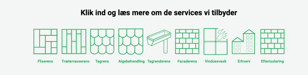 Fliser i indkørslen eller på terrassen bliver hurtigt grimme af alger og mos. Virksomheden tilbyder både rensning og imprægnering, som gør fliserne mere modstandsdygtige overfor snavs og fremtidig algevækst.