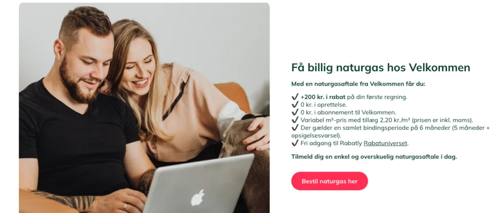 Velkommen er en dansk energileverandør, der tilbyder forskellige energiprodukter – herunder strøm, naturgas, mobil-, bredbånds- og forsikringsløsninger – samlet ét sted. Naturgasproduktet er en relativt ny del af deres portefølje, og fokus er på en enkel, overskuelig aftale med lave startomkostninger og en variabel prisstruktur.